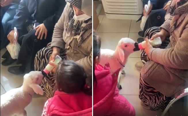 Görüntüde, muayene olmak için bekleyen bir kadının hastanede biberon ile kuzu beslediği görülüyor.