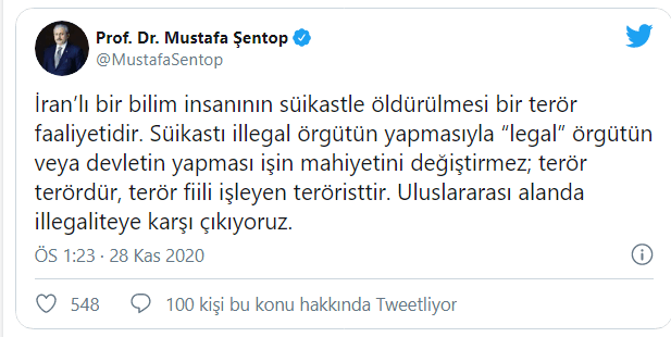 TBMM Başkanı Mustafa Şentop, sosyal medya platformu Twitter üzerindeki hesabından, İran'da gerçekleşen suikastle ilgili açıklamalarda bulundu. Şentop, İran nükleer programının kritik isimlerinden Muhsin Fahrizade'nin öldürülmesiyle ilgili olarak; suikast fiilini gerçekleştiren legal veya illegal bir örgüt veya devlet olsun ya da olmasın, işin mahiyetinin değişmediğine dikkat çekerek bunun bir terör eylemi olduğunu açıkladı.