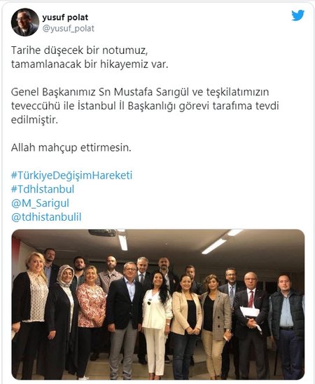 Türkiye Değişim Partisi için ilk adımlar atıldı. Bu bağlamda Mustafa Sarıgül'ün partisininde İstanbul İl Başkanı görevini yaparken görmek istediği isim Yusuf Polat oldu. Yusuf Polat, yeni görevini sosyal medya platformu Twitter üzerinden duyurararak, "Allah mahcup etmesin." dedi ve bu görevi kendisine veren Mustafa Sarıgül'e teşekkür ettiğini söyledi.