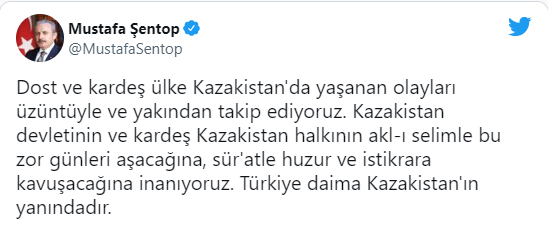"Dost ve kardeş ülke Kazakistan'da yaşanan olayları üzüntüyle ve yakından takip ediyoruz. Kazakistan devletinin ve kardeş Kazakistan halkının akl-ı selimle bu zor günleri aşacağına, sür'atle huzur ve istikrara kavuşacağına inanıyoruz. Türkiye daima Kazakistan'ın yanındadır." açıklamasında bulundu."