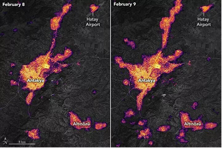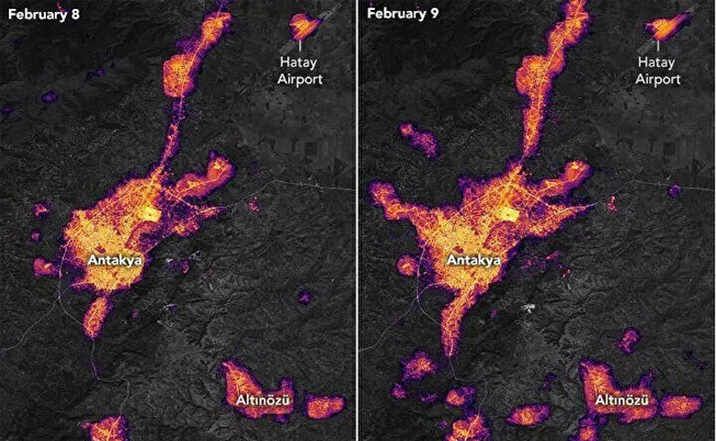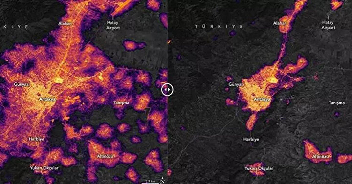 Black Marble HD ile çekilen görüntülerde Antakya'nın büyük bir kesiminin karanlığa büründüğü görünürken Kahramanmaraş ve Adıyaman'ın da karanlıkta kaldığı belirtildi.