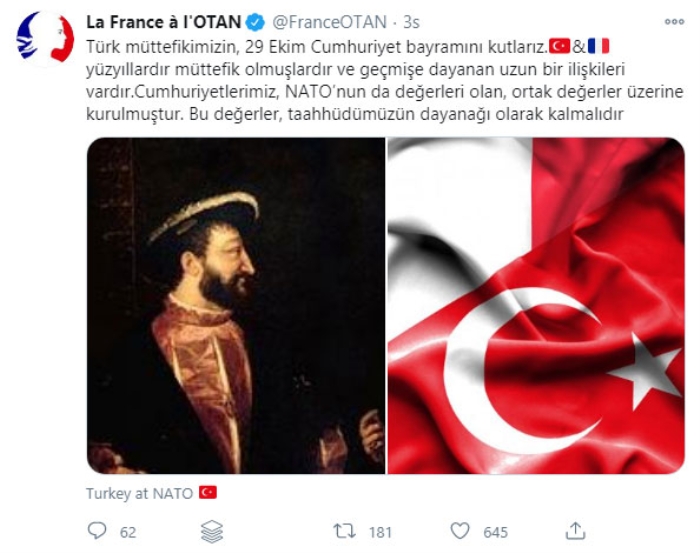 NATO Fransa Daimi Temsilciliği'ne ait resmi Twitter hesabı üzerinden, Kanuni Sultan Süleyman ve Fransa Kralı I. Fransuva'nın portresiyle beraber Türk bayrağı resmi de paylaşıldı. Dikkat çeken paylaşımda, "Türk müttefikimizin, 29 Ekim Cumhuriyet Bayramı'nı kutlarız." ifadeleri yer aldı.