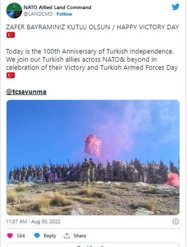 Paylaşımın devamında İngilizce, "Bugün Türk bağımsızlığının 100. yıl dönümü. Zafer ve Türk Silahlı Kuvvetleri Günü kutlamalarında NATO ve ötesindeki Türk müttefiklerimizin yanındayız" ifadeleri kullanıldı.