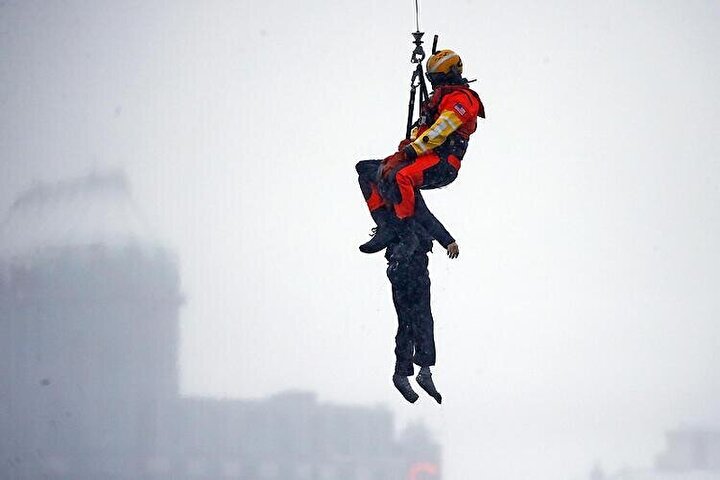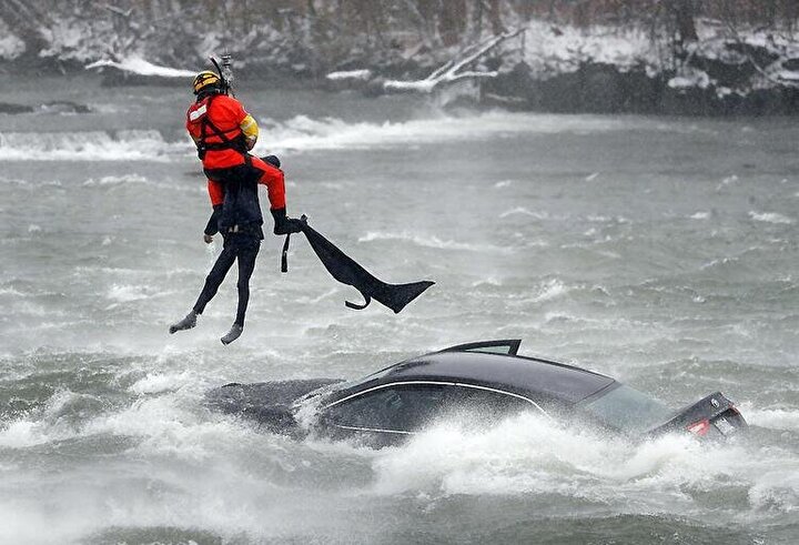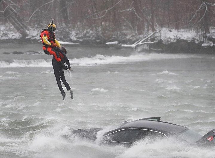 Olay yerine gelen helikopter ABD Sahil Güvenlik ekibinden cesur bir dalgıcın hızla suya gömülen arabanın üzerine sarkıtılması ve arabada sıkışan kadının bu şekilde çıkarılması için anında devreye girdi.
