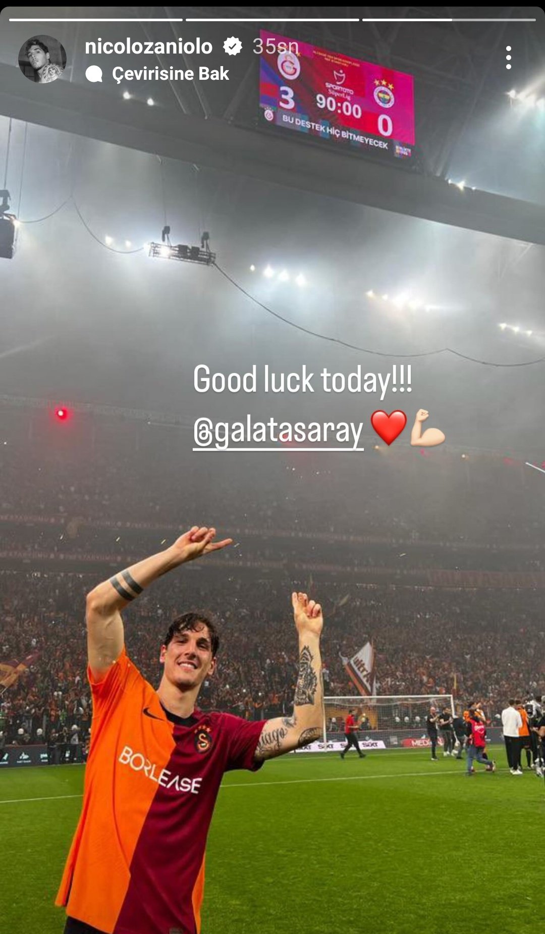 Dev derbi öncesinde, Galatasaray'ın sezon başında İngiltere Premier League ekibi Aston Villa'ya kiraladığı Nicolo Zaniolo'dan sarı-kırmızılılara destek paylaşımı geldi. İtalyan yıldız, paylaşımıyla sarı-kırmızılı takıma şans diledi.