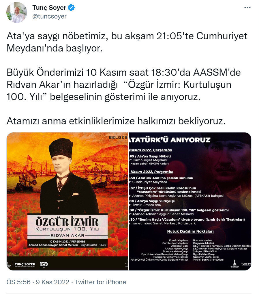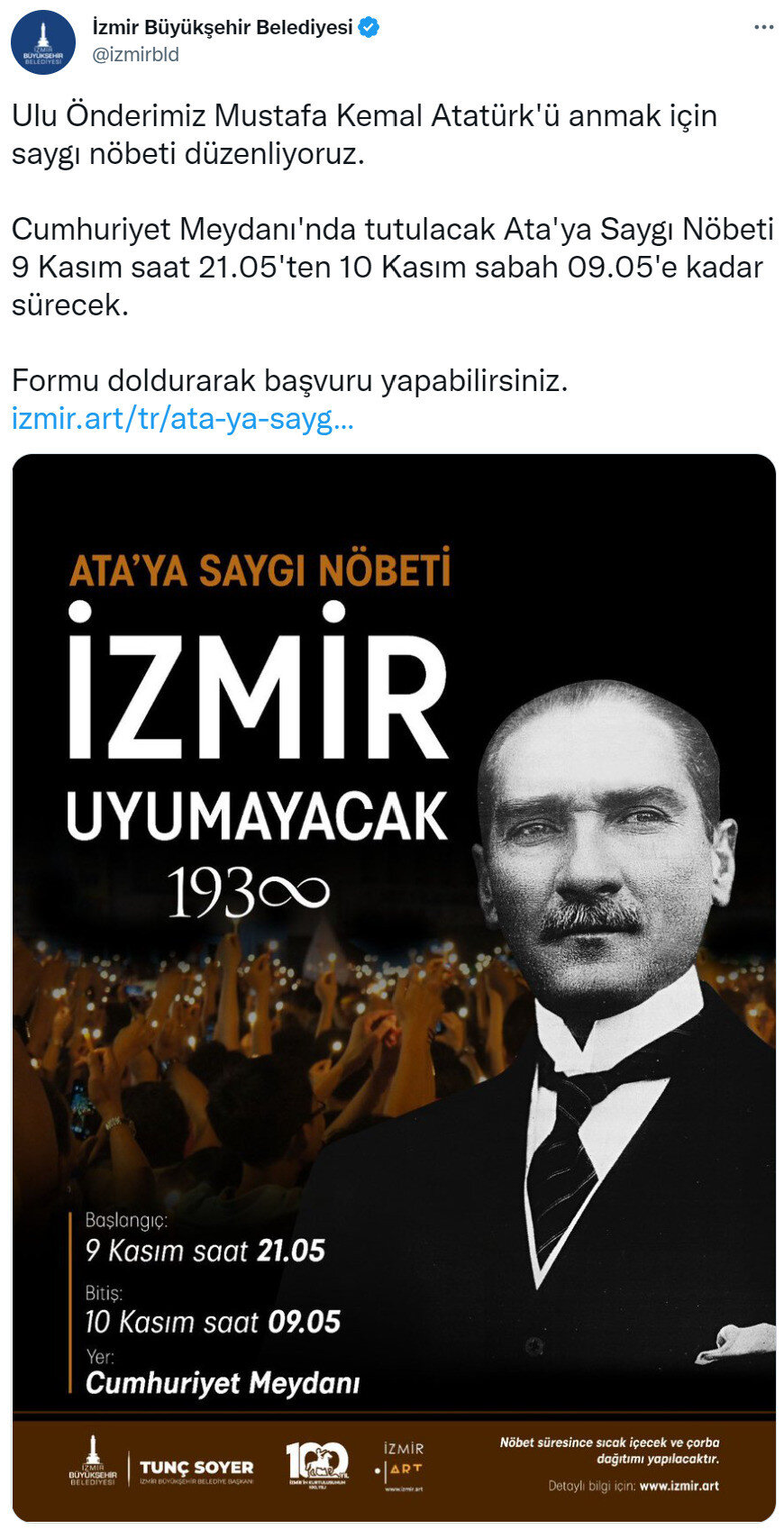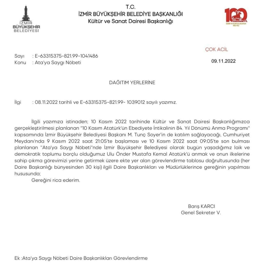 "İlgili yazımıza istinaden; 10 Kasım 2022 tarihinde Kültür ve Sanat Dairesi Başkanlığımızca gerçekleştirilmesi planlanan "10 Kasım Atatürk'ün Ebediyete İntikalinin 84. Yıl Dönümü Anma Programı" kapsamında İzmir Büyükşehir Belediyesi Başkanı M. Tunç Soyer'in de katılım sağlayacağı. Cumhuriyet Meydanı'nda 9 Kasım 2022 saat 21:05'te başlaması ve 10 Kasım 2022 saat 09:05'te son bulması planlanan "Ata'ya Saygı Nöbeti"nde Izmir Büyükşehir Belediyesi olarak bugün yaşadığımız laik ve demokratik toplumu borçlu olduğumuz Ulu Önder Mustafa Kemal Atatürk'ü anmak ve onun ilkelerine sahip çıkma görevimizi yerine getirmek üzere ekte yer alan görevlendirme tablosu doğrultusunda (her Daire Başkanlığı bünyesinden 30 kişi) ilgili Daire Başkanlıkları ve Müdürlüklerince gereğinin yapılması hususunda: Gereğini rica ederim. "