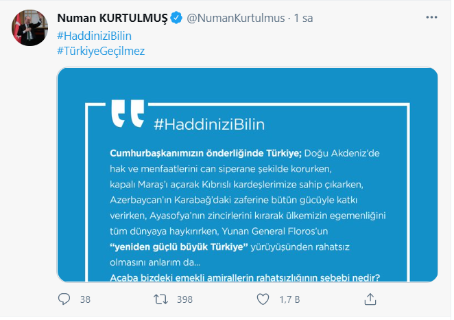 AK Parti Genel Başkanvekili Numan Kurtulmuş, sosyal medya hesabından "Haddinizi bilin", "Türkiye geçilmez" etiketiyle yaptığı paylaşımda, "Cumhurbaşkanımızın önderliğinde Türkiye, Doğu Akdeniz'de hak ve menfaatlerini cansiperane şekilde korurken, kapalı Maraş'ı açarak Kıbrıslı kardeşlerimize sahip çıkarken, Azerbaycan'ın Karabağ'daki zaferine bütün gücüyle katkı verirken, Ayasofya'nın zincirlerini kırarak ülkemizin egemenliğini tüm dünyaya haykırırken, Yunan General Floros'un 'yeniden güçlü büyük Türkiye' yürüyüşünden rahatsız olmasını anlarım da. Acaba bizdeki emekli amirallerin rahatsızlığının sebebi nedir?" ifadelerini kullandı.