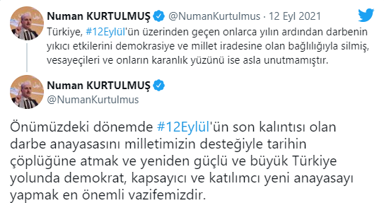 AK Parti Genel Başkanvekili Numan Kurtulmuş, Twitter adresinden "Türkiye, #12Eylül'ün üzerinden geçen onlarca yılın ardından darbenin yıkıcı etkilerini demokrasiye ve millet iradesine olan bağlılığıyla silmiş, vesayeçileri ve onların karanlık yüzünü ise asla unutmamıştır. Önümüzdeki dönemde #12Eylül'ün son kalıntısı olan darbe anayasasını milletimizin desteğiyle tarihin çöplüğüne atmak ve yeniden güçlü ve büyük Türkiye yolunda demokrat, kapsayıcı ve katılımcı yeni anayasayı yapmak en önemli vazifemizdir." açıklamasını yaptı.