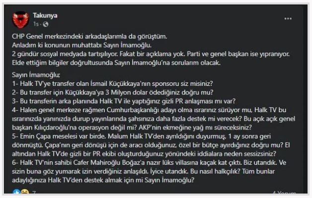 Özellikle seçim dönemlerinde CHP Genel Merkezine verdiği destek ile bilinen Fb.com/takunya isimli facebook sayfası, FOX TV'den Halk TV'ye 3 milyon dolar transfer ücreti karşılığında gittiği iddia edilen İsmail Küçükkaya'nın transferi hakkında şok iddialarda bulunarak, Ekrem İmamoğlu'na ağır suçlamalar yöneltti.