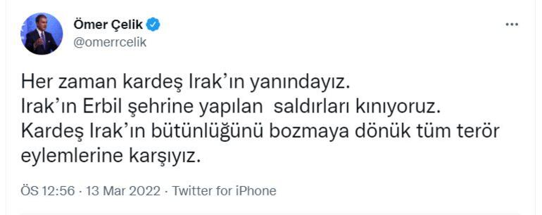 AK Parti Sözcüsü Çelik, Twitter hesabından yapıtığı açıklamada, "Her zaman kardeş Irak'ın yanındayız. Irak'ın Erbil şehrine yapılan saldırıları kınıyoruz. Kardeş Irak'ın bütünlüğünü bozmaya dönük tüm terör eylemlerine karşıyız" ifadelerini kullandı.