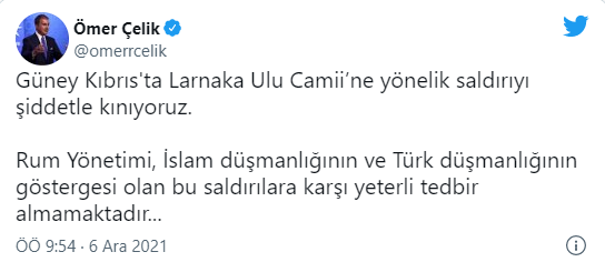 AK Parti Sözcüsü Ömer Çelik, Güney Kıbrıs Rum Yönetimi'ndeki Larnaka Büyük Camisi'ne yapılan saldırıyı şiddetle kınadı.