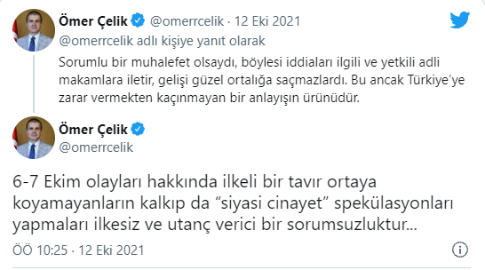 “Sorumlu bir muhalefet olsaydı, böylesi iddiaları ilgili ve yetkili adli makamlara iletir, gelişi güzel ortalığa saçmazlardı. Bu ancak Türkiye’ye zarar vermekten kaçınmayan bir anlayışın ürünüdür. 6-7 Ekim olayları hakkında ilkeli bir tavır ortaya koyamayanların kalkıp da ‘siyasi cinayet’ spekülasyonları yapmaları ilkesiz ve utanç verici bir sorumsuzluktur.”