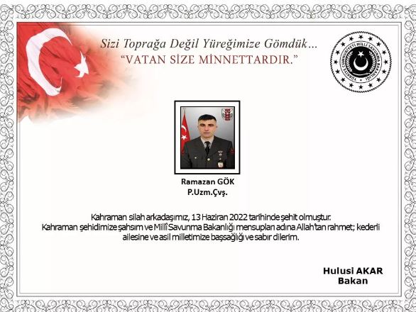 Bizleri derin bir acı ve üzüntüye boğan bu olayda hayatını kaybeden aziz şehidimize Allah’tan rahmet, kederli ailesine, Türk Silahlı Kuvvetleri ile asil milletimize başsağlığı ve sabır dileriz.