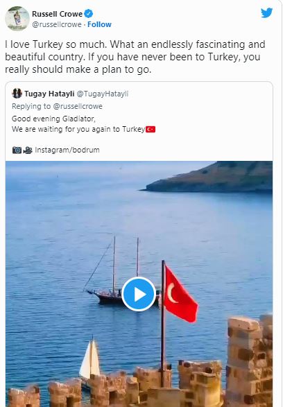 Türkiye'yi çok sevdiğini belirten Crowe, "Ne kadar da büyüleyici ve güzel bir ülke. Türkiye'ye hiç gitmediyseniz gitmek için gerçekten bir plan yapın." paylaşımında bulundu.
