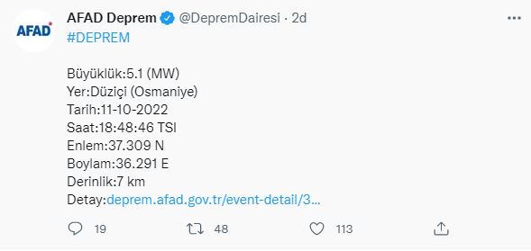 Osmaniye’nin Düziçi ilçesinde saat 18:48 sıralarında meydana gelen deprem 5.1 şiddetinde yerin 7 km derinliğinde oluştu.