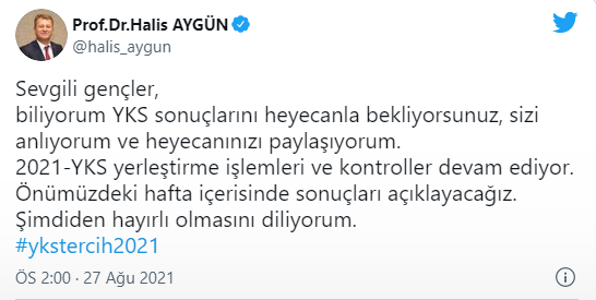 Aygün, Twitter hesabından yaptığı paylaşımda, "Sevgili gençler, biliyorum YKS sonuçlarını heyecanla bekliyorsunuz, sizi anlıyorum ve heyecanınızı paylaşıyorum. 2021-YKS yerleştirme işlemleri ve kontroller devam ediyor. Önümüzdeki hafta içerisinde sonuçları açıklayacağız. Şimdiden hayırlı olmasını diliyorum." ifadelerini kullandı.