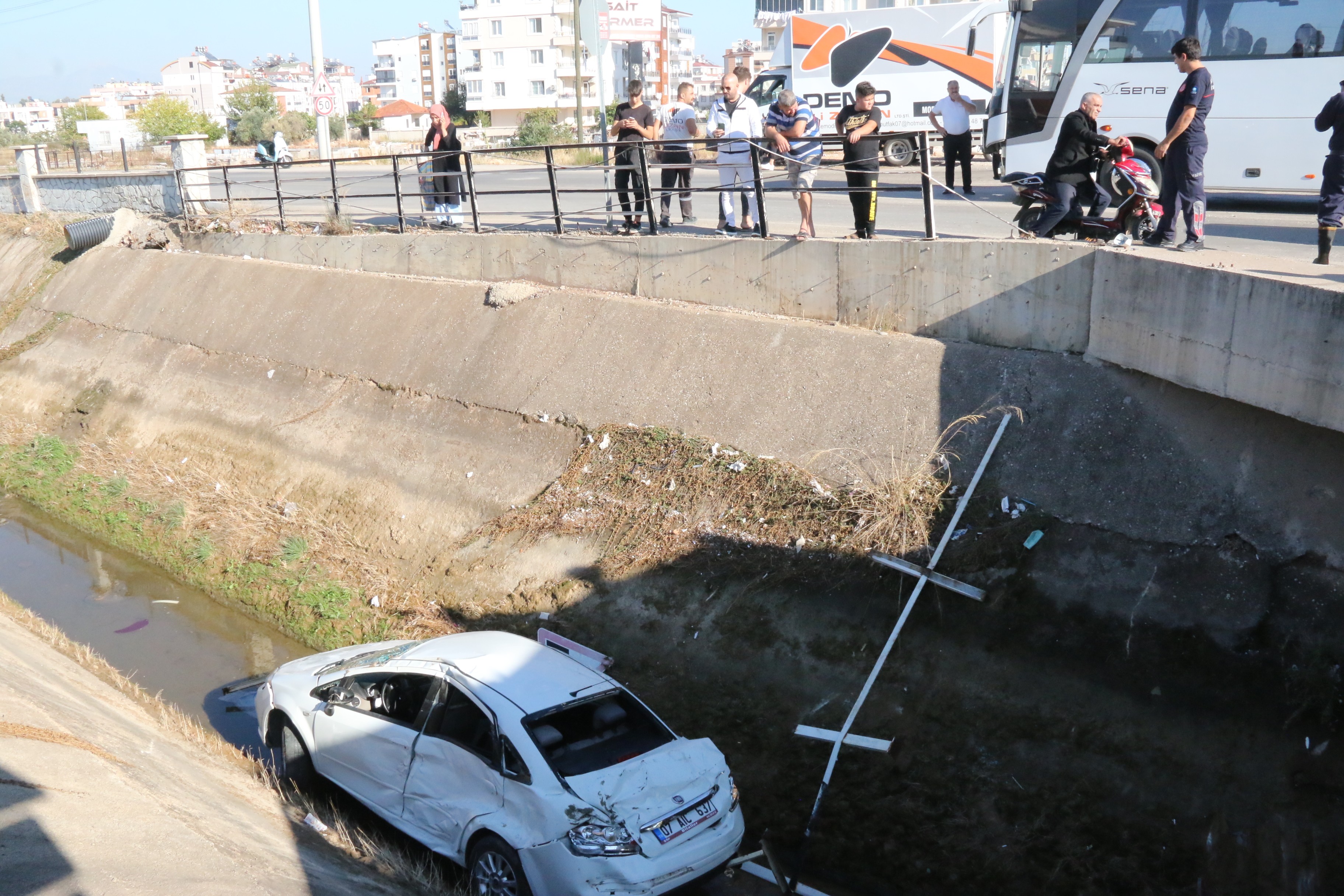 Kaza, Kepez İlçesi Ayhanoğlu Mahallesi Düden Caddesi üzerinde saat 14.45 sıralarında meydana geldi. Edinilen bilgiye göre; Şehit Musa Özkan Caddesi üzerinden şehir merkezine doğru hareket halinde bulunan Hülya Y., kontrolündeki 07 AIC 637 plakalı otomobil, Düden Caddesi üzerinde seyir halinde bulunan Murat İ., kontrolündeki 07 SN 511 plakalı otobüs ile çarpıştı. Çarpışmanın şiddeti ile sürücüsünün kontrolünden çıkan otomobil, demir korkulukları kırıp cadde üzerindeki su kanalına uçtu.