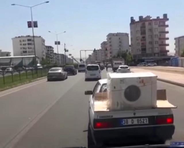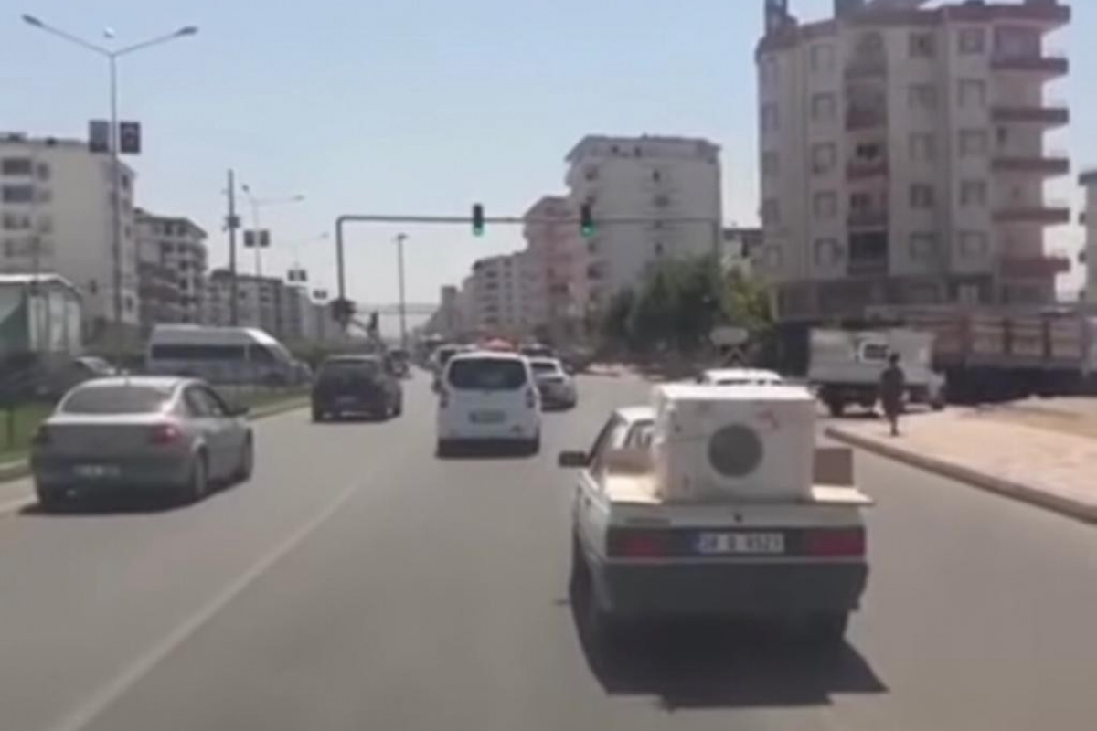 Otomobilin üzerine iple tutturulan çamaşır makinesinin olduğunu gören vatandaşlar, telefonlarına sarılarak bu tehlikeli yolculuğu kaydetti. Trafiğin yoğun olduğu caddede çamaşır makinesini taşıyan otomobil, sürücülerin tepkisini çekti.