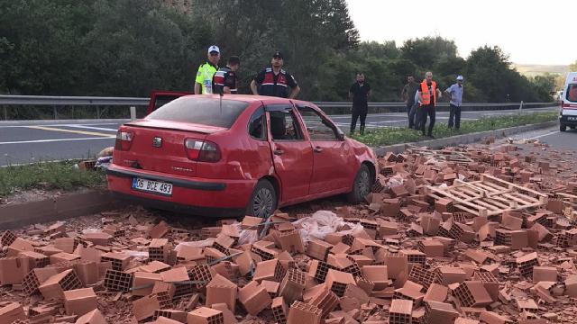 Karabük'ün Eskipazar ilçesinde O.N. idaresindeki tırın dorsesindeki tuğlalar, İsmetpaşa mevkisinde aynı yönde ilerleyen H.T. yönetimindeki plakalı otomobilin üzerine düştü.