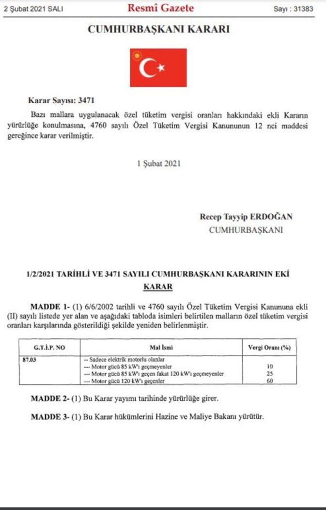 Kararla, motor gücü 85 kW olan elektrikli araçların ÖTV oranı yüzde 3'ten yüzde 10'a yükseldi. Motor gücü 85 kW ile 120 kW arasında kalan elektrikli araçların ÖTV oranı da yüzde 7'den 25'e çıktı.