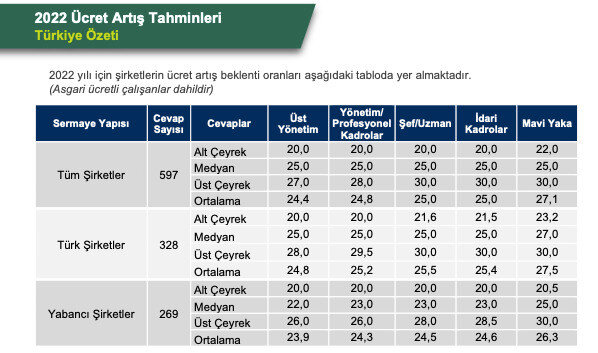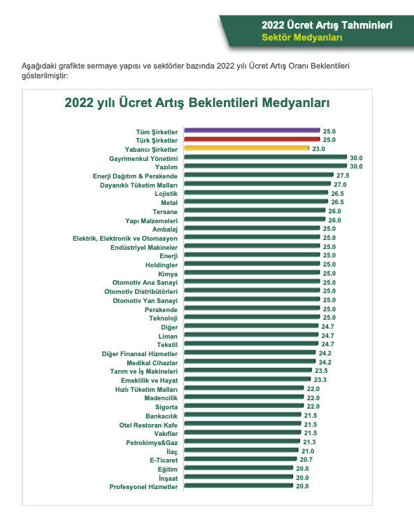 ABD Merkezli yönetim danışmanlığı firması Korn Ferry'nin, Türkiye'de faaliyet gösteren yerli ve yabancı sermayeli 643 şirketten gelen yanıtlarla hazırladığı rapora göre özel sektör 2022 için maaş artışlarında yüzde 20-25 arasına göre planlama yapıyor.