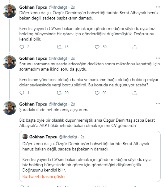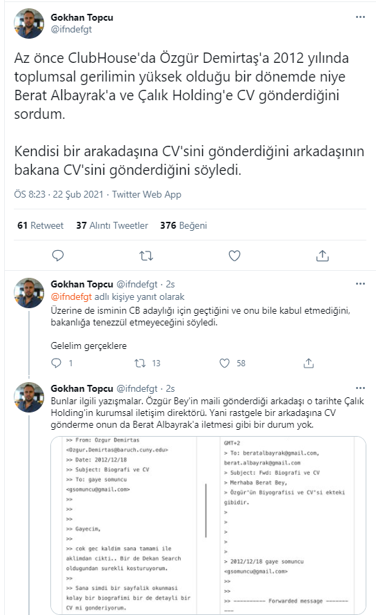 Topçu'nun iddiasına göre ünlü ekonomist Özgür Demirtaş, 18 Aralık 2012 tarihinde Çalık Holding'te Kurumsal İletişim Direktörü Gaye Somuncu aracılığıyla Hazine ve Maliye eski Bakanı Berat Albayrak'la iletişime geçti.