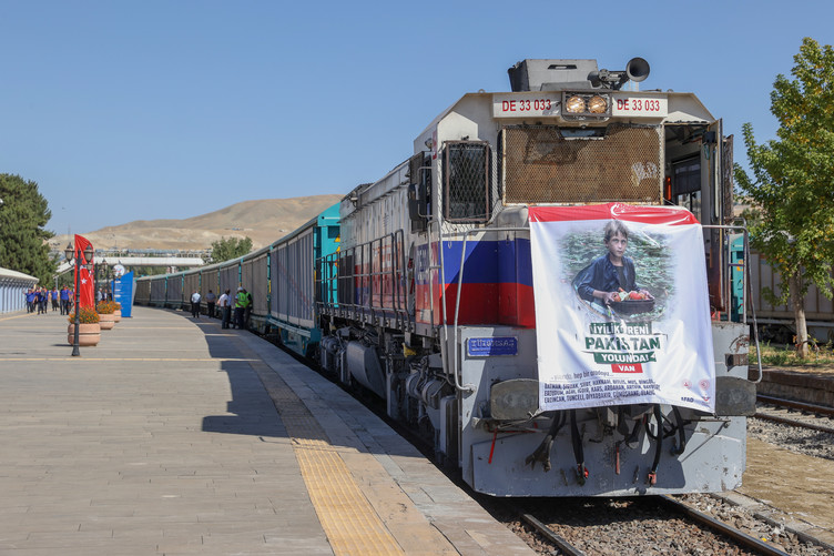 Van Valiliği koordinatörlüğünde İl Afet ve Acil Durum Müdürlüğünce 21 ilde hazırlanan 811 ton 330 kilogram ağırlığındaki 53 bin 950 gıda kolisi, Van Tren Garı'nda vagonlara yüklenerek Pakistan'a gönderildi.