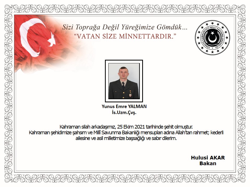 Açıklamada, "Bizleri derin bir acı ve üzüntüye boğan bu olayda hayatını kaybeden aziz şehidimize Allah'tan rahmet, kederli ailesine, Türk Silahlı Kuvvetleri ile asil milletimize başsağlığı ve sabır, yaralı silah arkadaşımıza acil şifalar dileriz." ifadesine yer verildi.