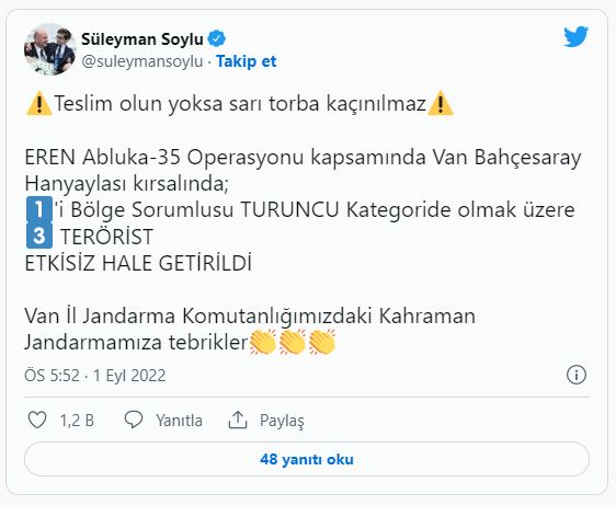 Sosyal medya hesabından açıklama yapan İçişleri Bakanı Soylu, “Eren Abluka-35 Operasyonu'nda biri bölge sorumlusu üç terörist etkisiz hale getirildi.” dedi.