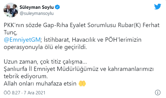 İçişleri Bakanı Süleyman Soylu, sosyal medya hesabından yaptığı paylaşımda, "PKK’nın sözde Gap-Rıha Eyalet Sorumlusu Rubar kod adlı Ferhat Tunç, Emniyet Genel Müdürlüğü, İstihbarat, Havacılık ve PÖH'lerimizin operasyonuyla ölü ele geçirildi." notunu düştü.