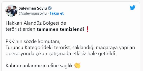 İçişleri Bakanı Süleyman Soylu, Hakkari Alandüz bölgesinin teröristlerden tamamen temizlendiğini belirterek, "PKK’nın sözde komutanı,Turuncu Kategorideki terörist, saklandığı mağaraya yapılan operasyonda çıkan çatışmada etkisiz hale getirildi" dedi.