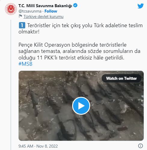 Paylaşımda, "Teröristler için tek çıkış yolu Türk adaletine teslim olmaktır!" ifadeleri kullanılarak, bölgedeki terörist temizliğinin azim ve kararlılıkla devam edeceği bildirildi.