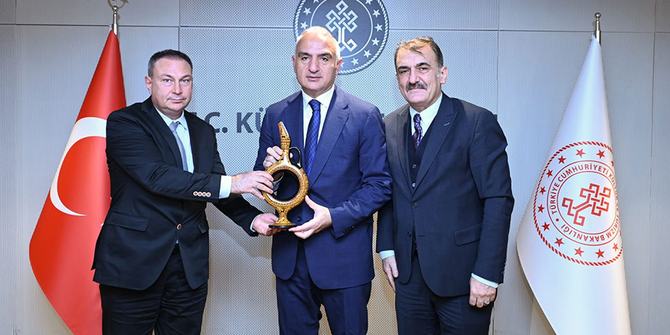 RATEM Yönetim Kurulu Başkanı Aydın Şerbetioğlu; Başkan Yardımcıları Mustafa Öztürkişler, Banu Genç Sayman, Zafer Beyaz; Yönetim Kurulu Üyeleri Mustafa Boydak, Şaban Kardeş, Muammer Altınok, Bulut Yıldırım ve Mustafa Melih Tarlacı tarafından düzenlenen ziyarette, Kapadokya bölgesinin ünlü Avanos el sanatlarından olan Hitit Güneşi, Bakan Mehmet Nuri Ersoy’a hediye olarak takdim edildi.