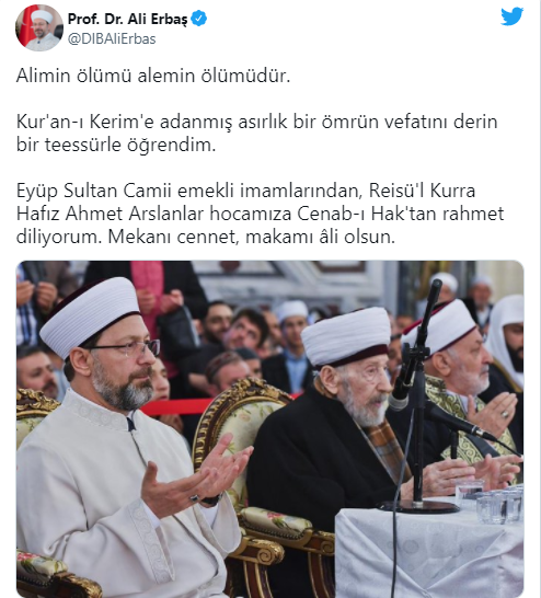 “Alimin ölümü alemin ölümüdür. Kur'an-ı Kerim'e adanmış asırlık bir ömrün vefatını derin bir teessürle öğrendim. Eyüp Sultan Camii emekli imamlarından, Reisü'l Kurra Hafız Ahmet Arslanlar hocamıza Cenab-ı Hak'tan rahmet diliyorum. Mekanı cennet, makamı âli olsun.”