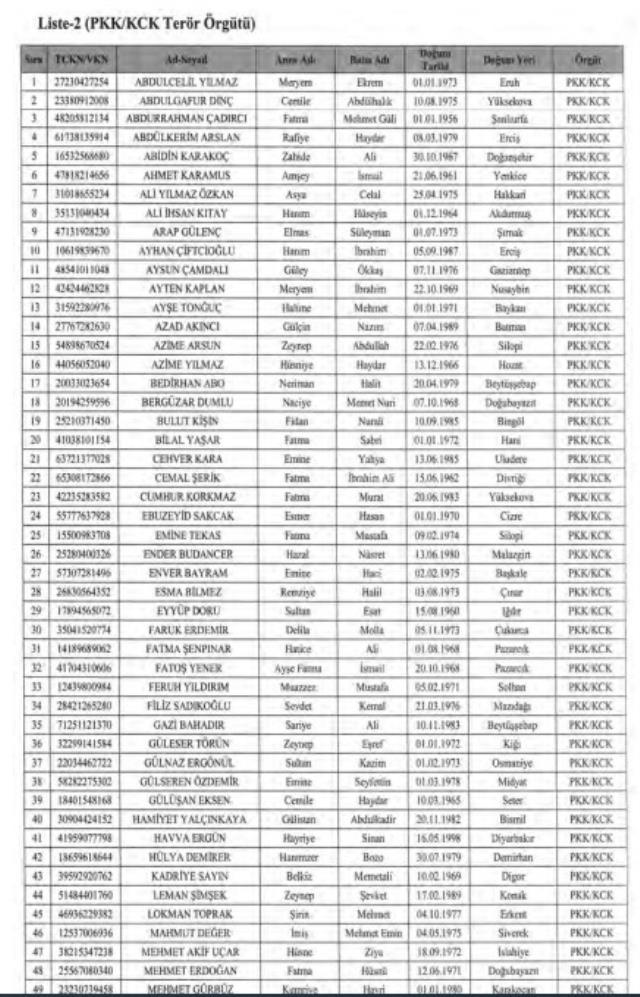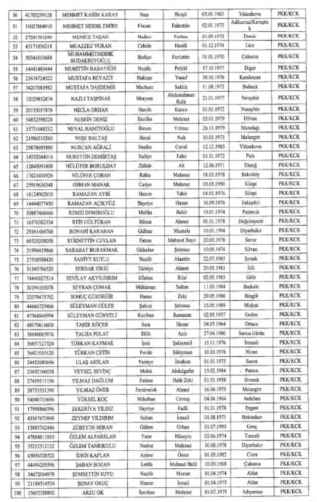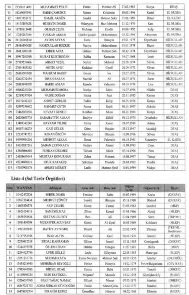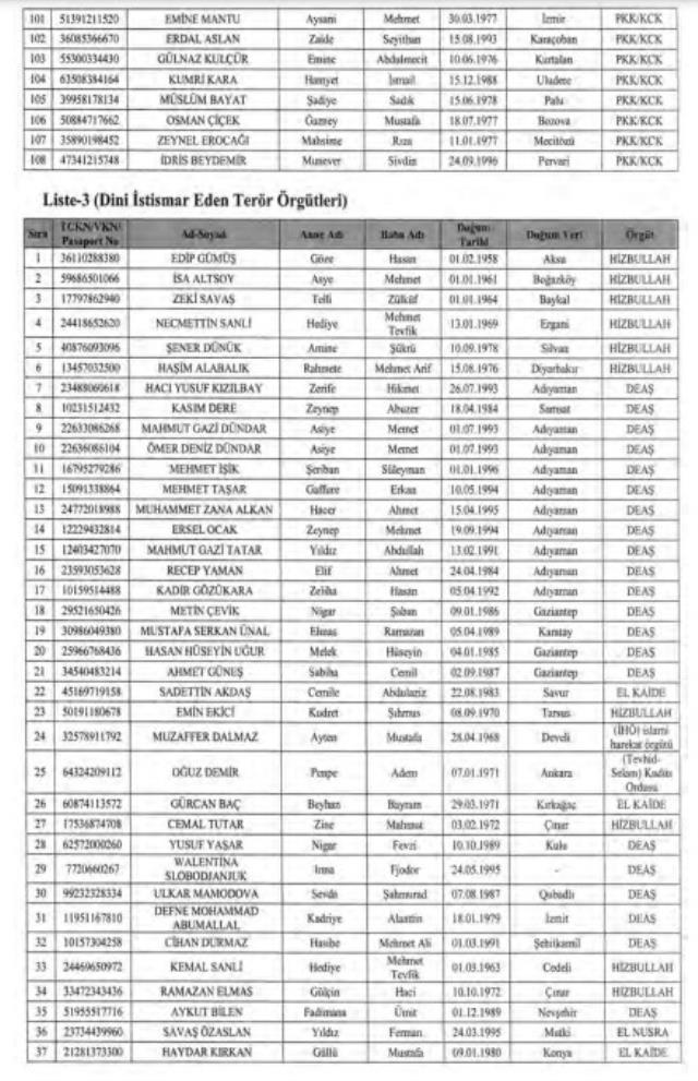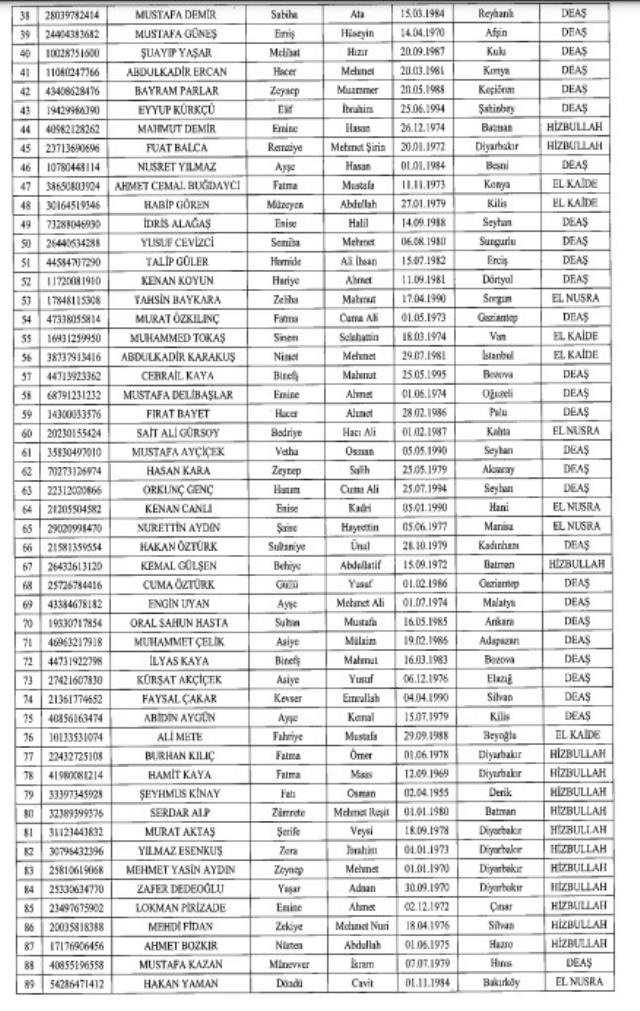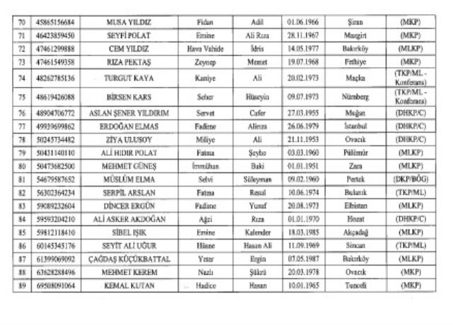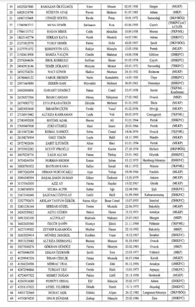Listede söz konusu örgüt üyesi Atalay Candelen, Cevheri Güven, Fikret Seçen, Osman Şimşek, Said Sefa, Sevgi Akarçeşme, Tarık Toros, Tuncay Opçin ve Zekeriya Öz gibi firari isimler yer aldı.