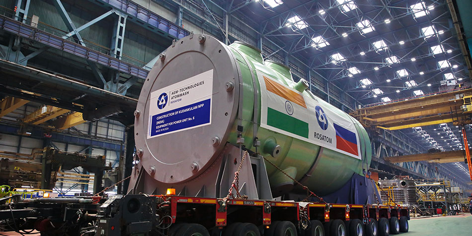 Rusya Devlet Nükleer Enerji Kuruluşu Rosatom’un makine mühendisliği bölümü Atomenergomash’e bağlı Atommash tesisi, Hindistan'da inşa halindeki Rus tasarımı Kudankulam Nükleer Güç Santrali’nin (NGS) 6. Güç Ünitesi için tasarlanan VVER-1000 reaktör kabını sevk etti. 320 ton ağırlığındaki ekipman inşaat sahasına naklediliyor.