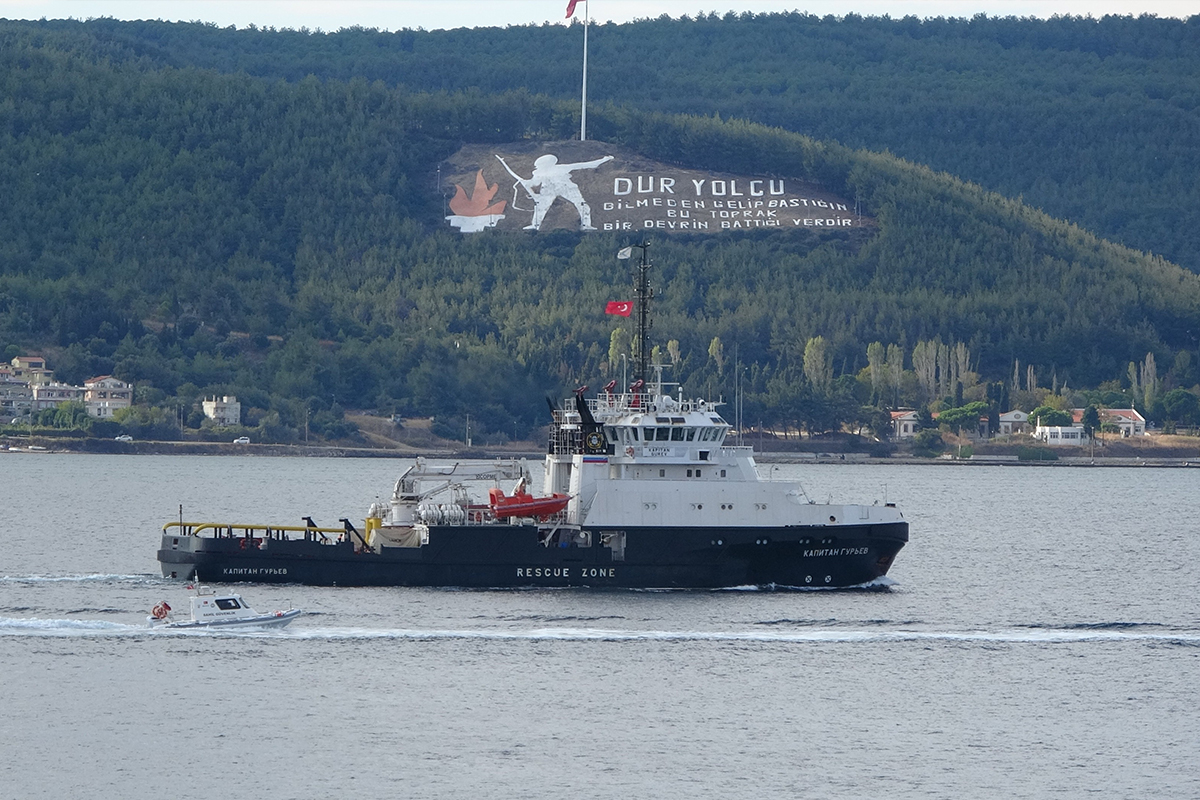 Ege Denizi'nden saat 14.00'da Çanakkale Boğazı'na giriş yapan, 'Captain Guryev' isimli askeri römorkör, saat 15.30 sıralarında Çanakkale önlerinde oldu. Kilitbahir Kalesi ve ‘Dur Yolcu' yazısını geçen askeri römorkör, Marmara Denizi'ne doğru yol aldı. Askeri römorköre boğazı geçişi sırasında Türk Sahil Güvenlik botları eşlik etti.