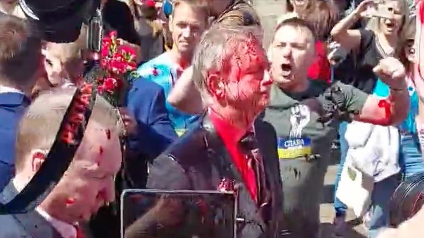 Rusya'nın Ukrayna'daki savaşına karşı çıkan bir grup aktivist, Varşova'daki Sovyet asker mezarlığını ziyaret ettiği sırada Büyükelçi Andreev'e kırmızı boya attı.