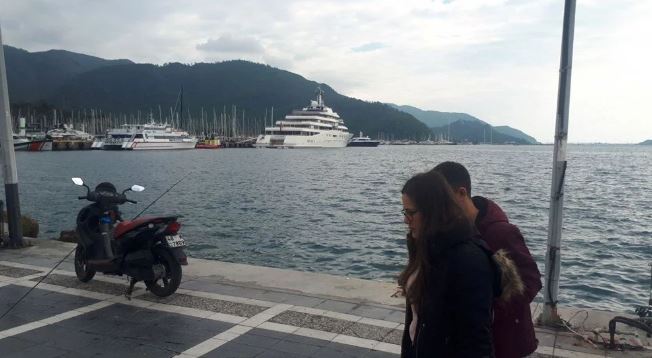Limanda yürüyüş yapan turistler ve vatandaşlar, cep telefonlarıyla mega yatın fotoğraf ve videolarını çekti.