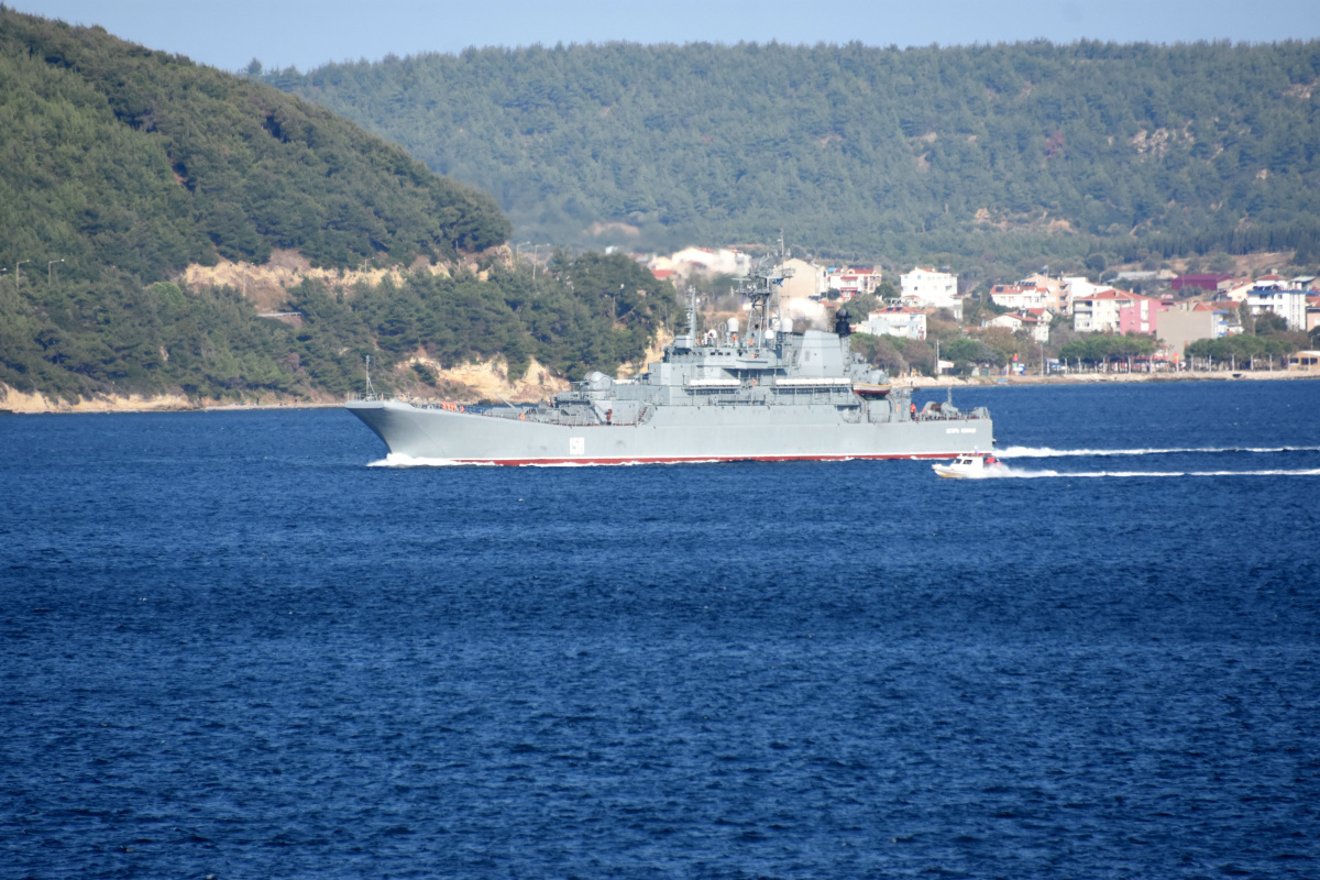 Kilitbahir Kalesi önünden Ege Denizi'ne doğru yol alan 112 metre uzunluğundaki Rus savaş gemisine boğaz geçişi sırasında Türk sahil güvenlik botu da refakat etti.
