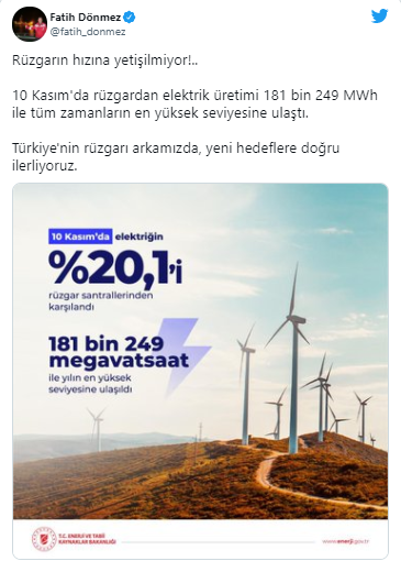 Paylaşımında "Rüzgarın hızına yetişilmiyor!" diyen Bakan Dönmez, "10 Kasım'da rüzgardan elektrik üretimi 181 bin 249 MWh ile tüm zamanların en yüksek seviyesine ulaştı. Türkiye'nin rüzgarı arkamızda, yeni hedeflere doğru ilerliyoruz." ifadelerine yer verdi.