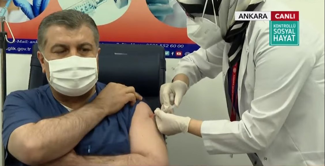 Sağlık Bakanı Fahrettin Koca Türkiye İlaç ve Tıbbi Cihaz Kurumu'nun CoronaVac aşısına "Acil Kullanım Onayı" vermesinin ardından canlı yayında aşı oldu. Böylelikle Türkiye'deki ilk aşı Sağlık Bakanı Fahrettin Koca'ya vurulmuş oldu.