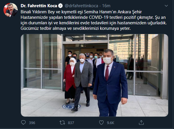 "Binali Yıldırım Bey ve kıymetli eşi Semiha Hanım'ın Ankara Şehir Hastanemizde yapılan tetkiklerinde COVID-19 testleri pozitif çıkmıştır. Şu an için durumları iyi ve kendilerini evde tedavileri için hastanemizden uğurladık. Gücümüz tedbir almaya ve sevdiklerimizi korumaya yeter."