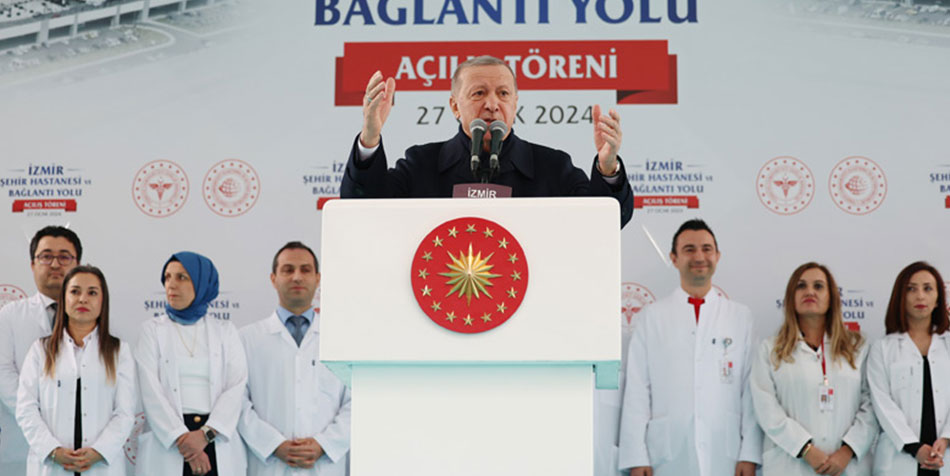 Şehirlerin tamamını binalarıyla, donanımıyla, teçhizatıyla, ambulansıyla en modern sağlık hizmetlerine kavuşturduklarını vurgulayan Cumhurbaşkanı Erdoğan, şunları kaydetti: “İzmir’de olduğu gibi pek çok yerde faaliyete geçen şehir hastaneleriyle, sağlık hizmetlerini dünya standartlarının üstünde bir seviyeye taşıdık. Yaklaşık 310 bini doktor olmak üzere 1,5 milyona yakın sağlık çalışanıyla bu alandaki insan kaynağımızı güçlendirdik. Ülke genelinde 2,5 milyon kişiye evde sağlık hizmeti vererek, hizmeti insanımızın ayağına götürdük.”