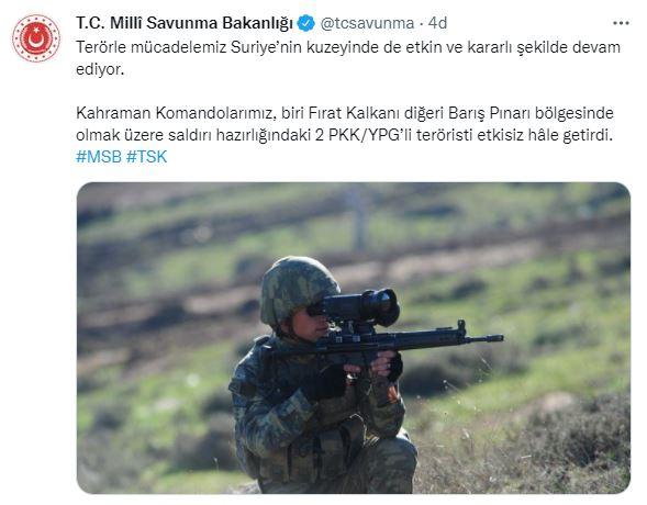 MSB'den yapılan açıklamada, "Kahraman Komandolarımız, biri Fırat Kalkanı diğeri Barış Pınarı bölgesinde olmak üzere saldırı hazırlığındaki 2 PKK/YPG’li teröristi etkisiz hâle getirdi." dedi.