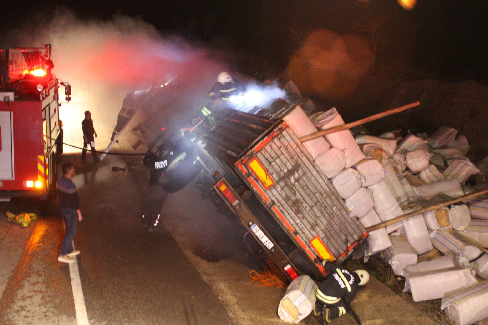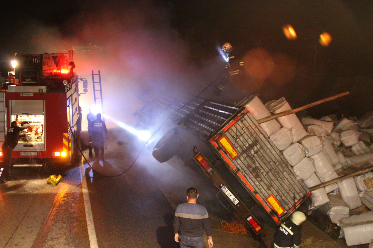 Olay yerine hemen itfaiye ekipleri sevk edildi. Dorsesinde 25 ton saman bulunan tırdaki yangın büyümeden itfaiye ekiplerinin müdahalesiyle kontrol altına alındı.