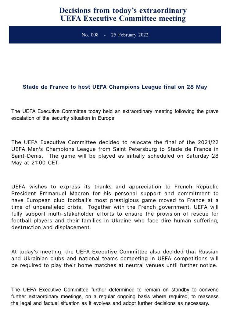 Öte yandan UEFA, bugün yapılan toplantıda UEFA turnuvalarında yer alan Rus ve Ukrayna kulüpleri ile milli takımlarının bir sonraki duyuruya kadar iç saha maçlarını tarafsız sahalarda oynamasına karar verdi.
