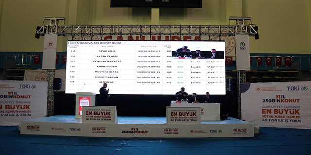 Şanlıurfa 11 Nisan Spor Salonu'nda gerçekleştirilen programda, kurada ismi çıkan hak sahiplerinin adları tek tek okunup dijital ekrana yansıtıldı.