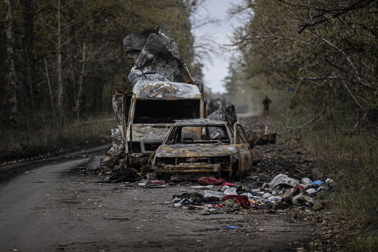 Şehrin girişinde, Ukrayna güçlerince top atışlarıyla hedef alınan Rus güçlerine ait yanmış bir konvoy da yer alıyor.