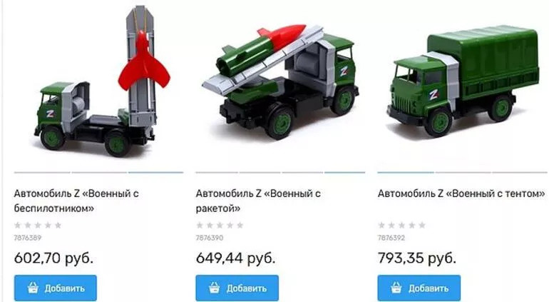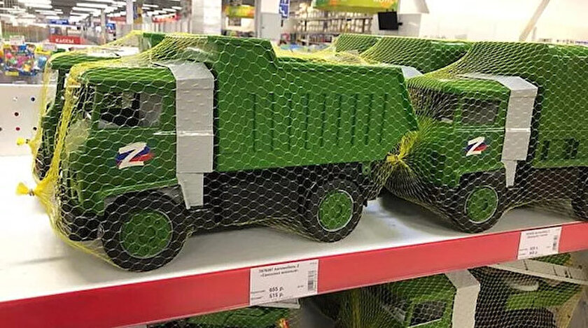 Rus çevrimiçi pazar yeri EONK, bu oyuncakları yaklaşık 9,5 pounda satmaya başladı. Bu oyuncaklar arasında askeri kamyonlar, çoklu roketatar sistemleri ve yakıt tankerleri var. Vladimir Putin'in Ukrayna'yı işgaliyle eş anlamlı hale gelen Z Sembolü tüm bu oyuncakların üzerinde göze çarpıyor.